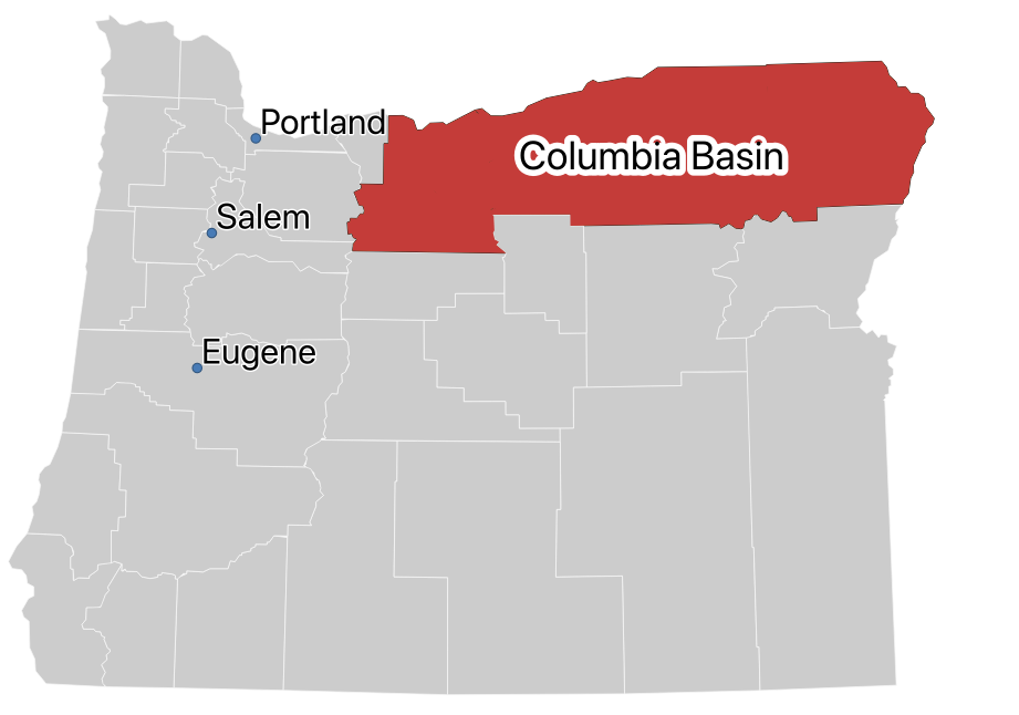 Moving from the national to the regional level, we first examine the region in which the overwhelming majority of Oregon’s wind farms are located: the Columbia Basin. The Columbia Basin is an area located in both Oregon and Washington. In Oregon, this area is characterized by rolling hills and dry grasslands (Anderson et al. 1998). It is also sparsely populated with Sherman and Gilliam counties, the counties containing the ten largest wind farms in Oregon, only accounting for about 0.1% percent of Oregon’s total population (“U.S. Census Bureau QuickFacts: Oregon” n.d.; Hoen et al. 2020). This population is also overwhelming white at nearly 88% (“U.S. Census Bureau QuickFacts: Oregon” n.d.).